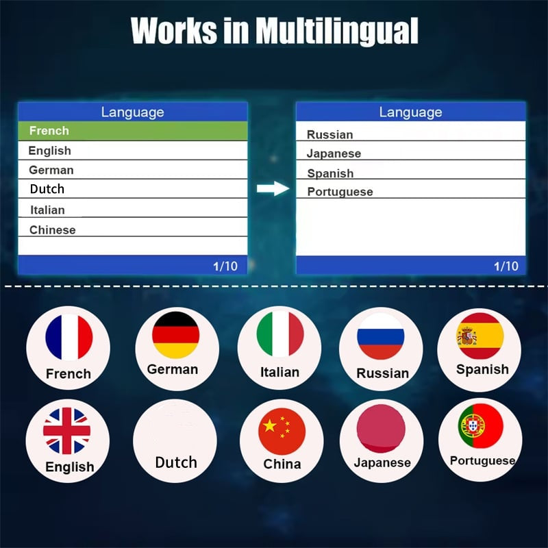 SOUTIEN MULTILINGUE : Prend en charge 10 langues : anglais, allemand, français, espagnol, italien, russe, nĂ©erlandais, chinois, japonais et portugais â idĂ©al pour les conducteurs internationaux.